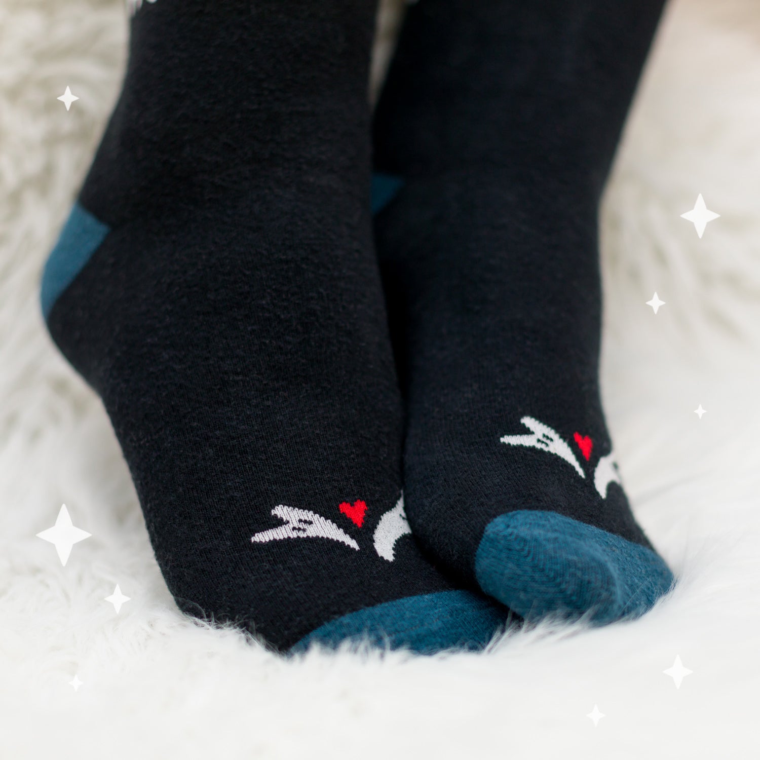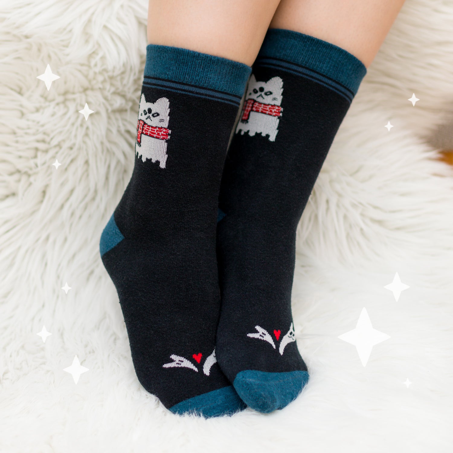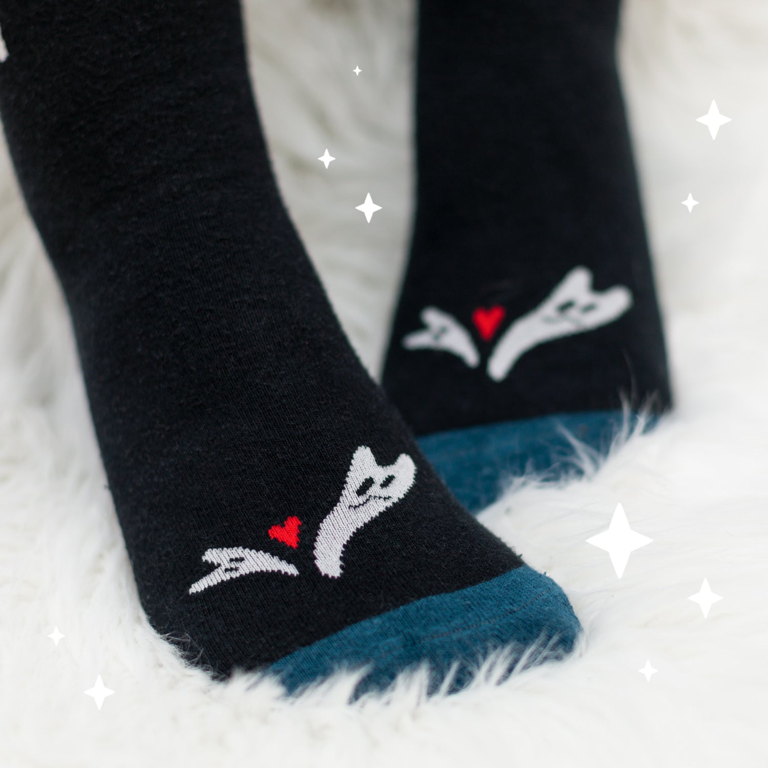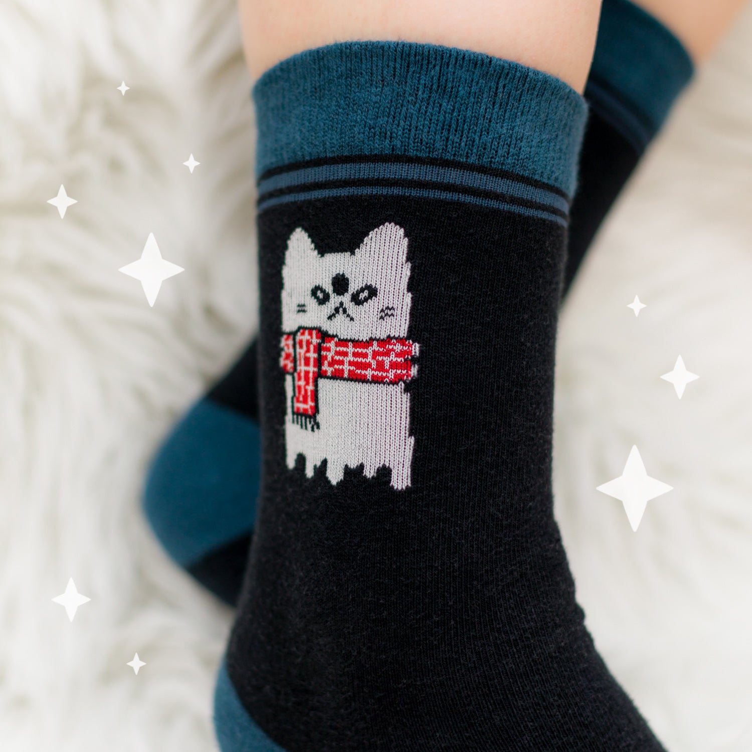 Design flaw! While my other sock designs from this batch have had manufacturing issues, these only have a tiny issue on my part, in the design - I did not consider how much stretch there will be at the top of the socks, so the cat ghostie is much wider than I intended it to be. But other than that, they're completely fine!! So if you like the wide ghostie, you're basically getting a bargain :D