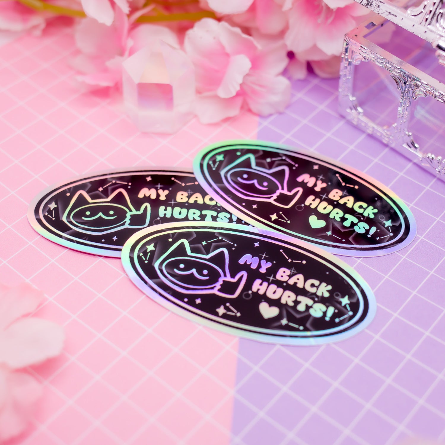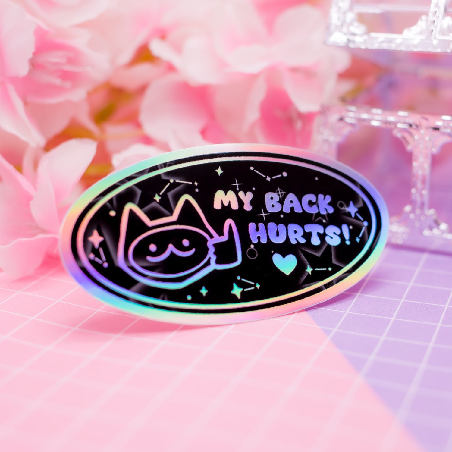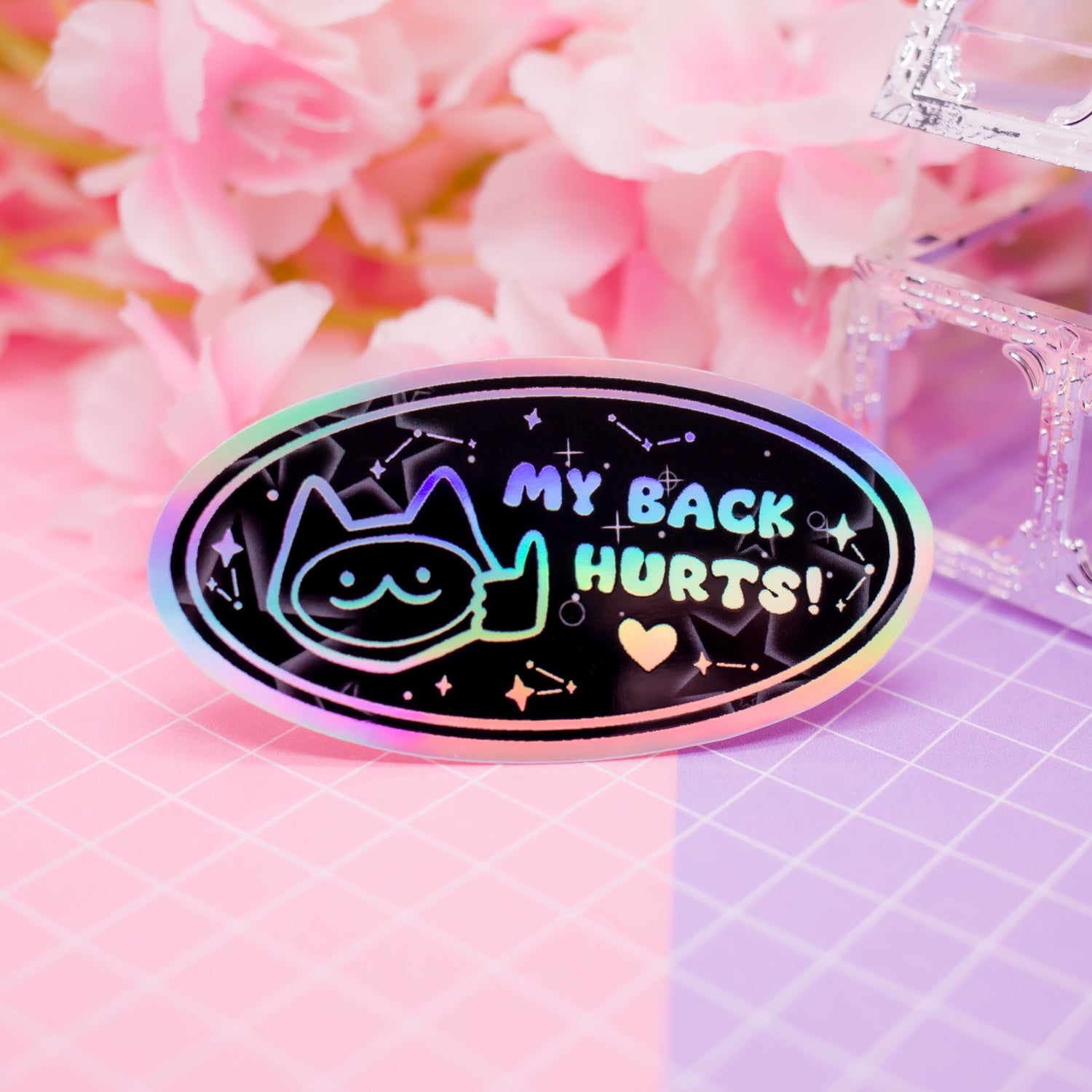 Cat "MY BACK HURTS" holographic vinyl sticker