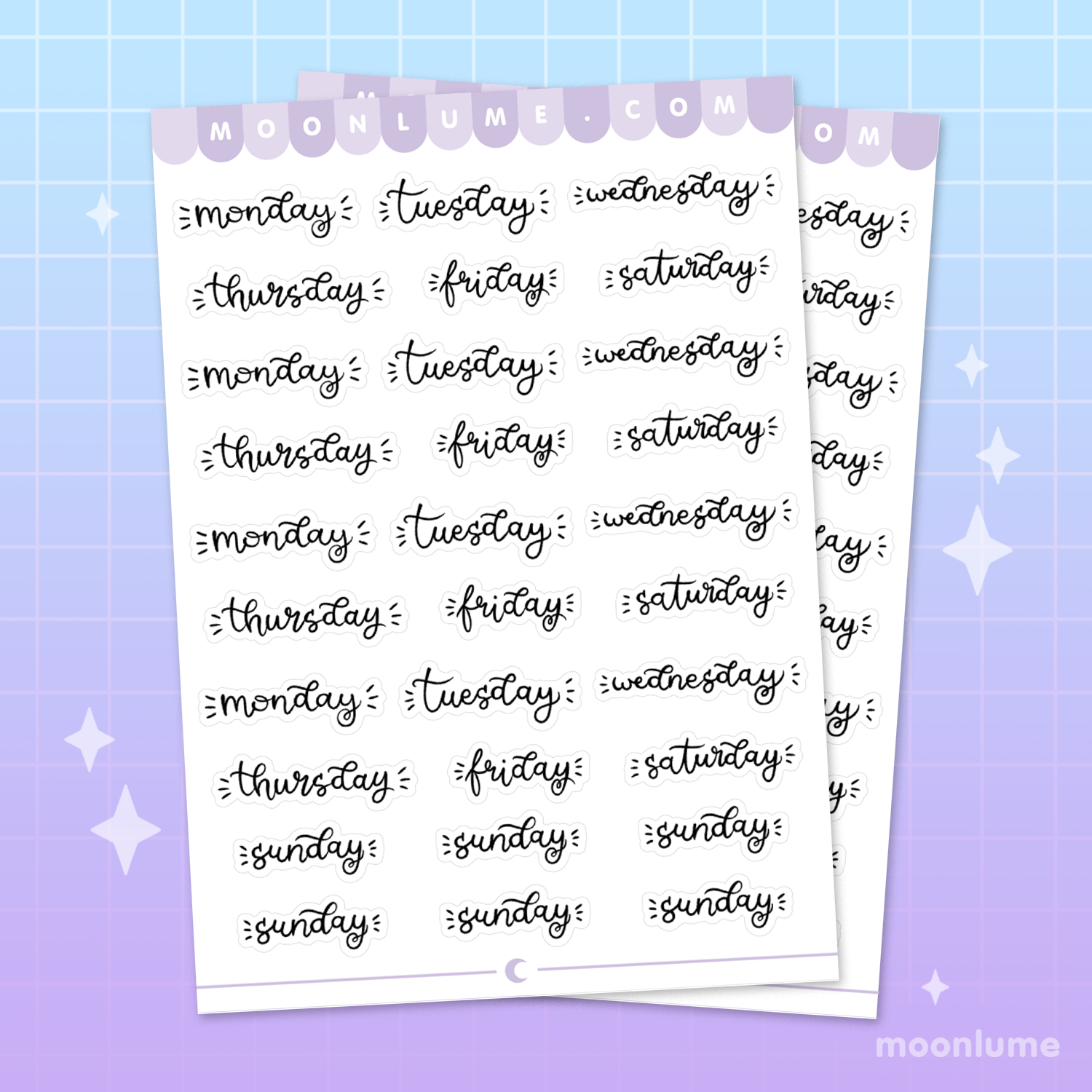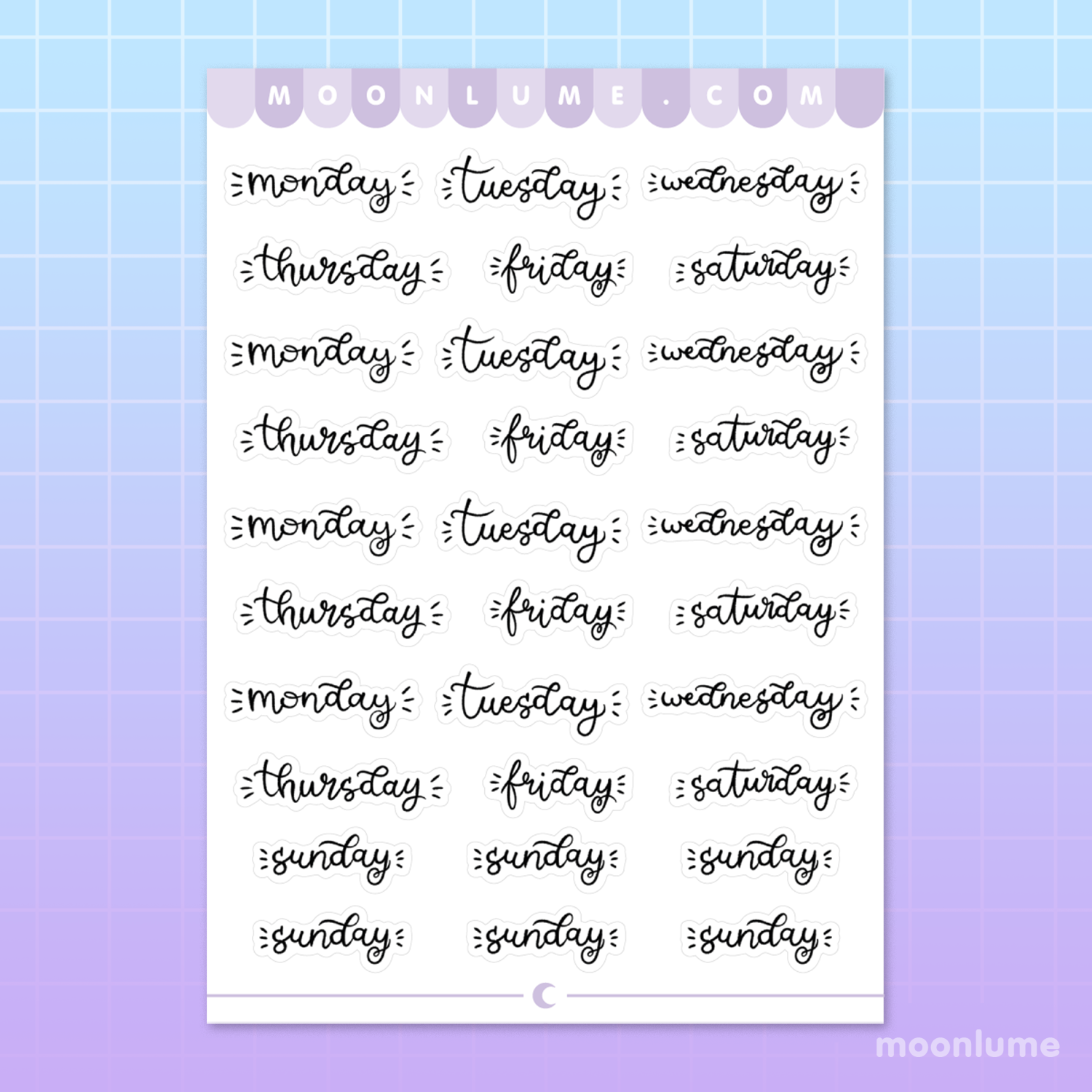 A sticker sheet full of weekdays handwritten by yours truly! Perfect for bullet journals, scrapbooks and planners. And yes, it... comes with two extra Sundays, because there was no other way to put these together haha! :')