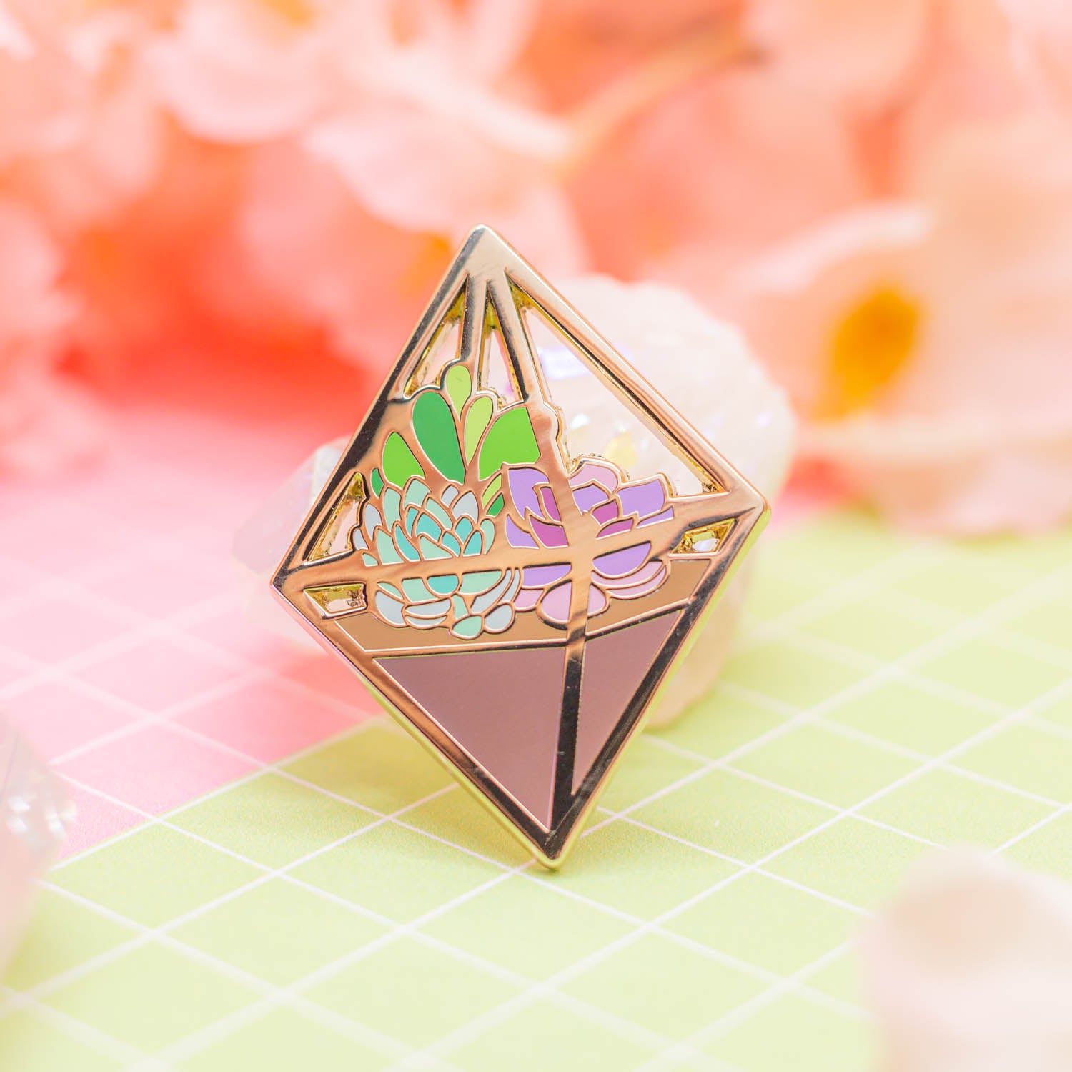Colourful succulent enamel pins for my fellow plant lovers! The key feature of these is that they are hollow to imitate a glass terrarium - so any material you pin them on will be seen through the "glass" bits!