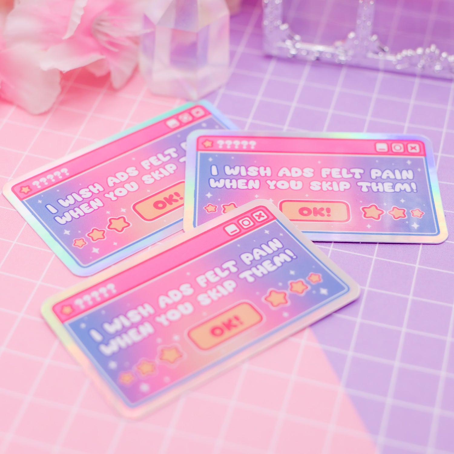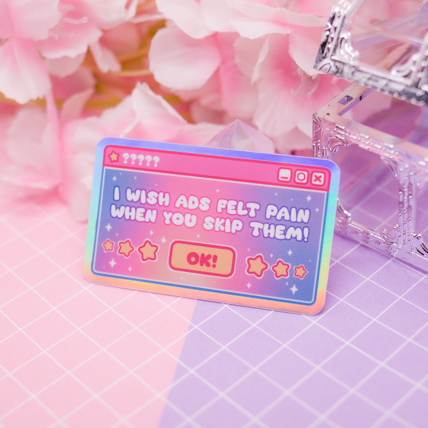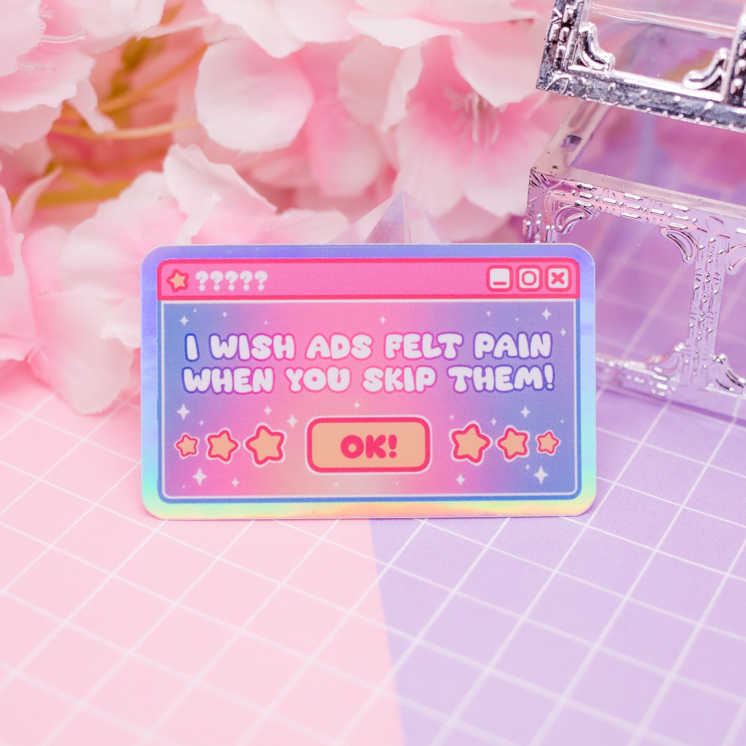 "I wish ADs felt pain when you skip them!" UI window holographic vinyl sticker
