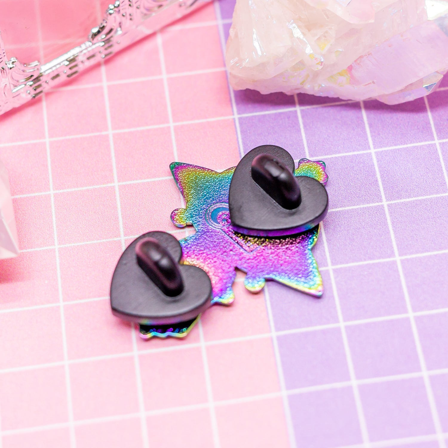 • Keep in mind that rainbow plating is incredibly random. As you can see in the photos, some pins will be more pink, some more blue, more green or more yellow. The exact colors on your pin will be random, please understand that this is not something I can control!