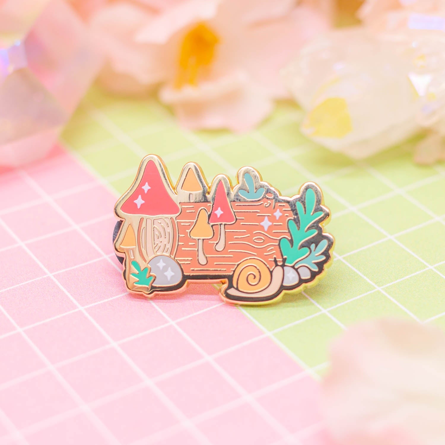 A cute cottagecore themed pin featuring an overgrown tree log and a little snail friend!